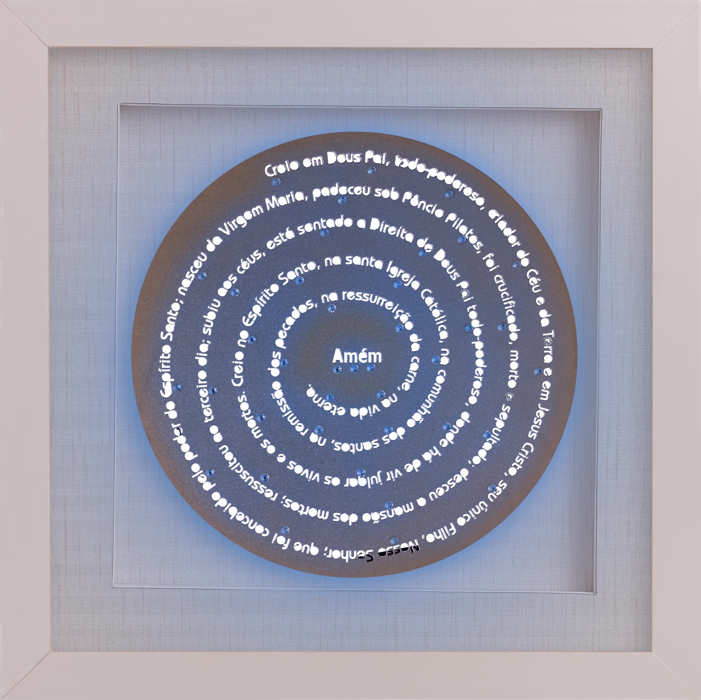 Linda mandala com a oração que cria uma união muito especial sua com Deus em um quadro de madeira laqueada (com tratamento especial contra cupim) e profundidade de 2,5cm. Vidro incolor de 2mm, fundo de papel de parede importado (vinílico), base de fundo foam board (antimofo), colagem de cristais decorativos e iluminação de led. Com moldura nas cores branca, preta, prata, dourada, champanhe e madeira imbuia. Opção de formato quadrado.