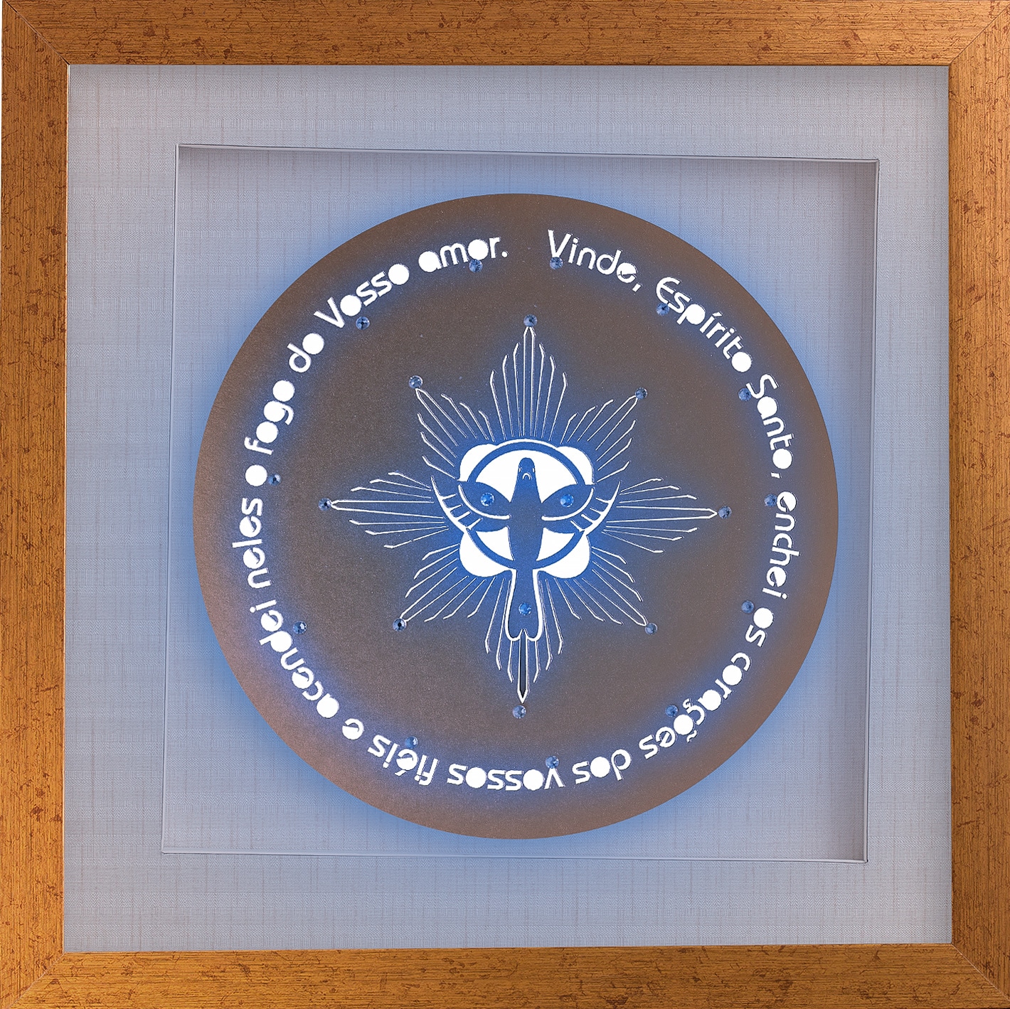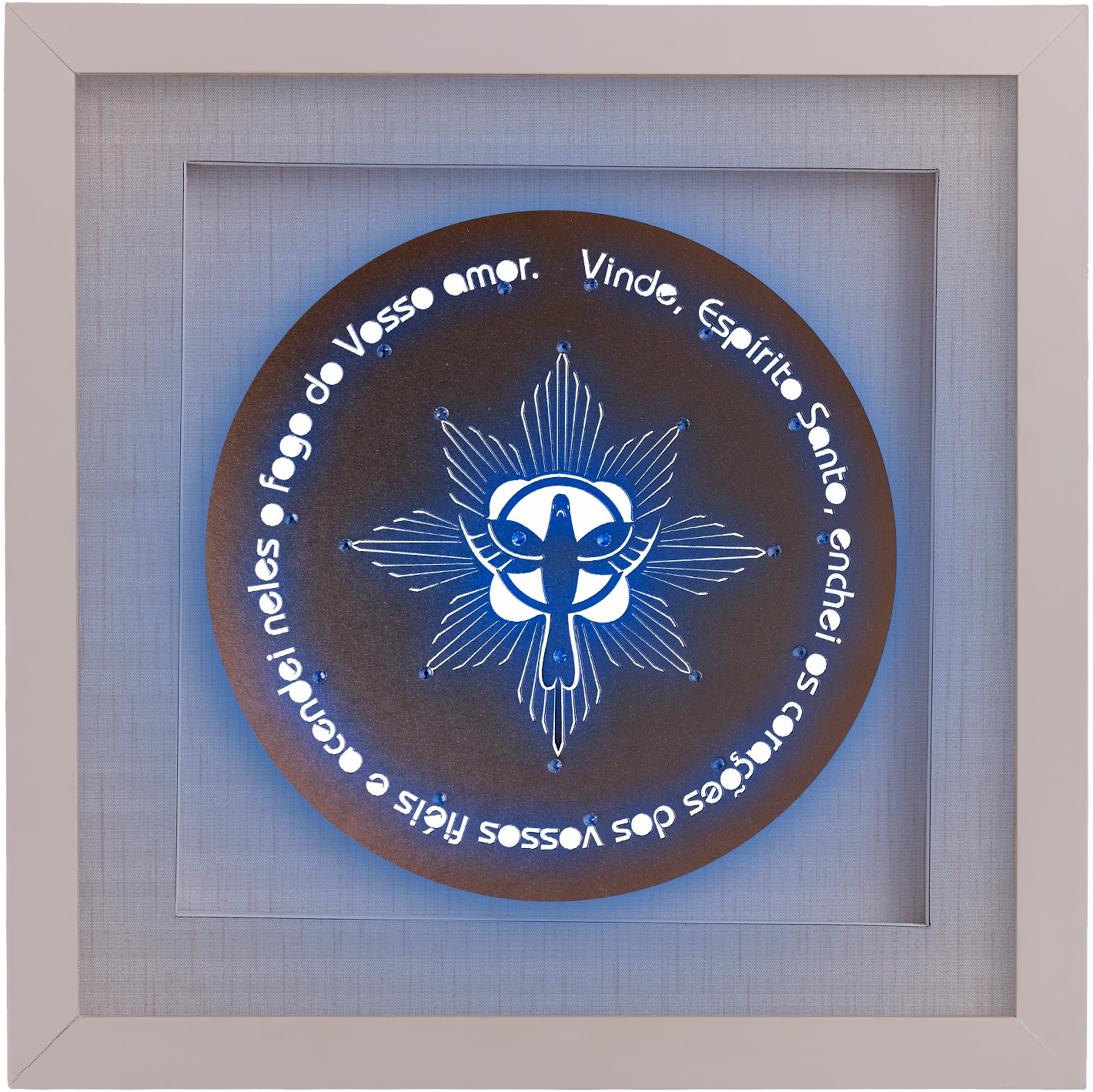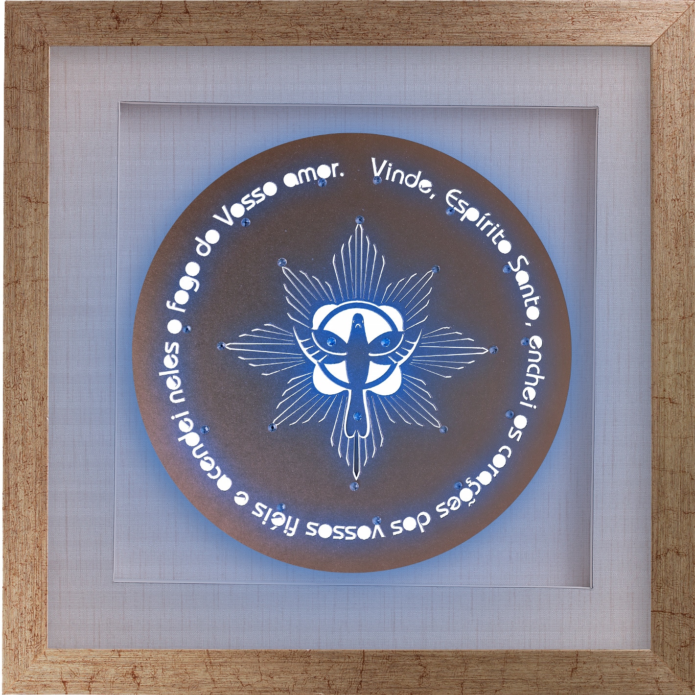 Uma oração para você fortalecer sua fé e elevar o Espírito Santo. Linda mandala em quadro de madeira, laqueada (com tratamento contra cupim) e profundidade de 2,5cm. Vidro incolor de 2mm, fundo de papel de parede importado (vinílico), base de fundo foam board (antimofo), colagem de cristais decorativos, iluminação de led. Com moldura das cores branca, preta, prata, dourada, champanhe e madeira imbuia. Opção de formato quadrado.