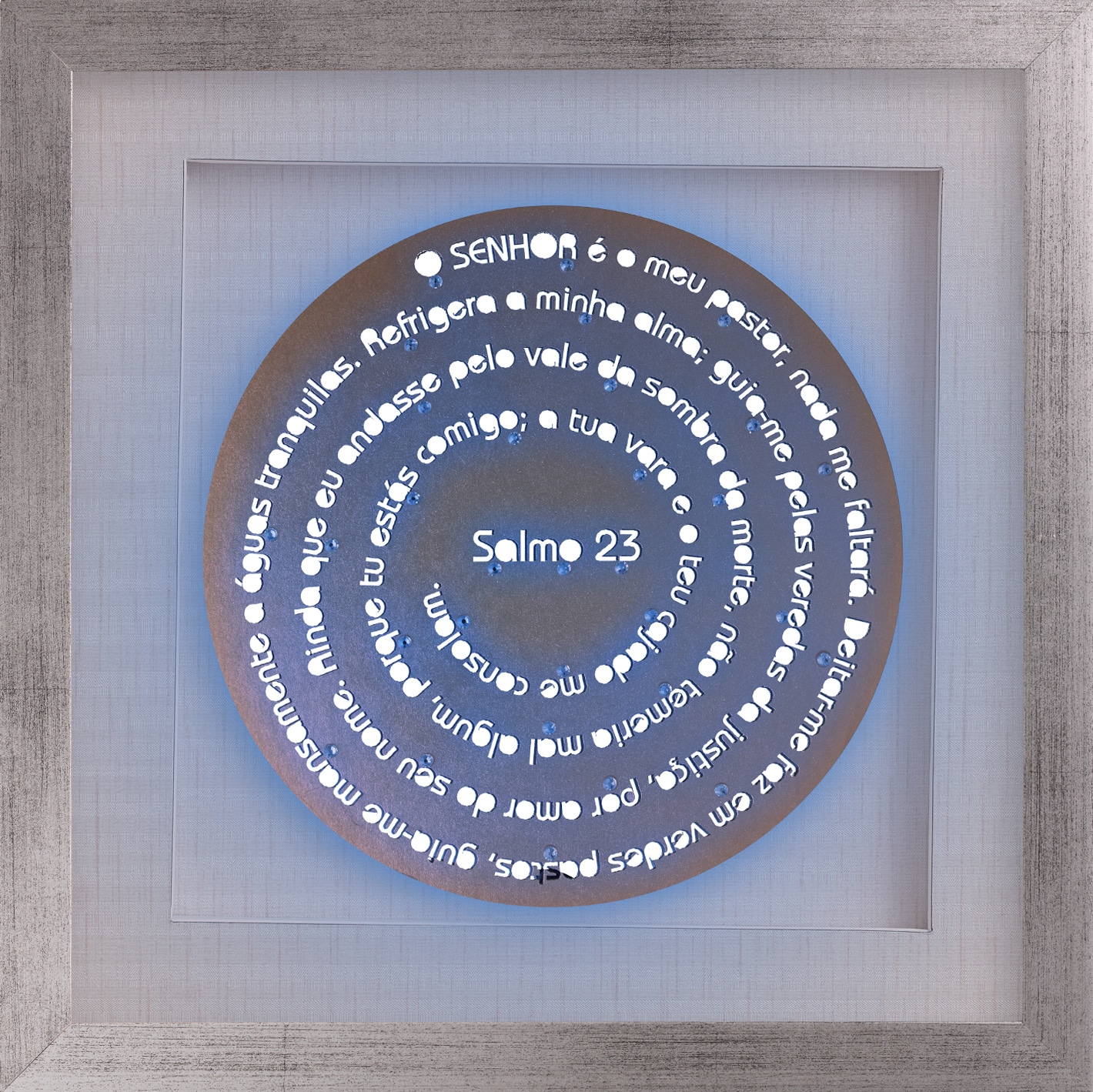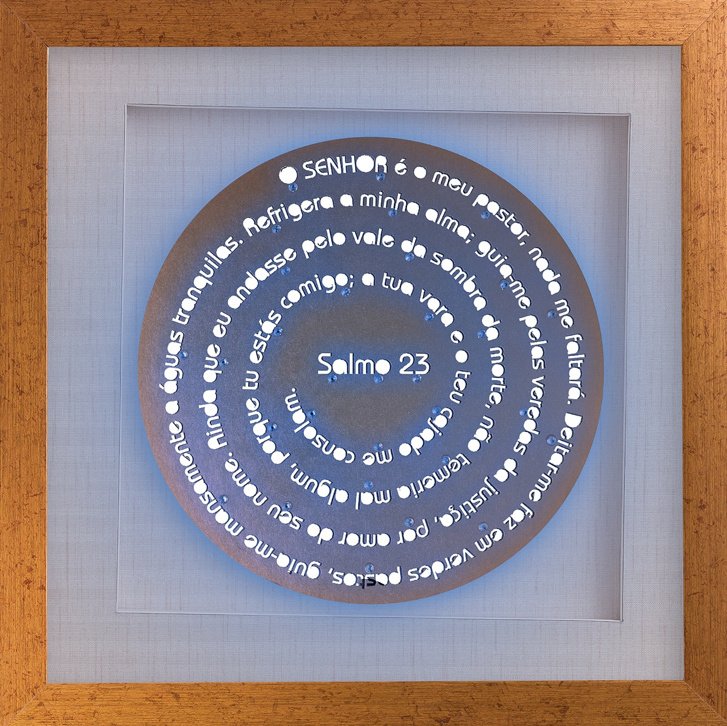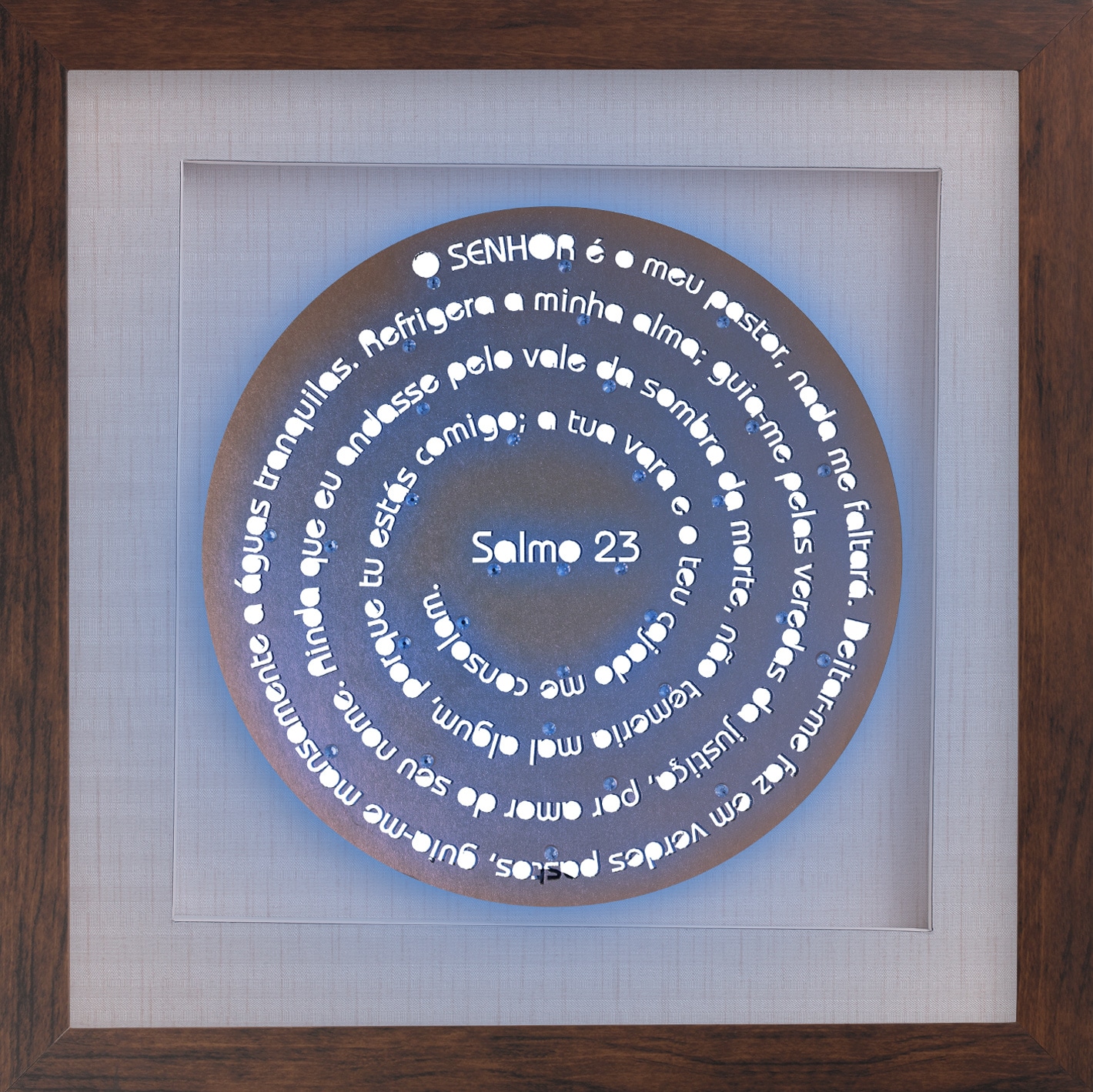 Uma linha mandala com o salmo que todos apreciam e conhecem de cor. Quadro de madeira laqueada (com tratamento contra cupim) e profundidade de 2,5cm. Vidro incolor de 2mm, fundo de papel de parede importado (vinílico), base de fundo foam board (antimofo), colagem de cristais decorativos e iluminação de led. Com moldura nas cores branca, preta, prata, dourada, champanhe e madeira imbuia. Opção de formato quadrado.