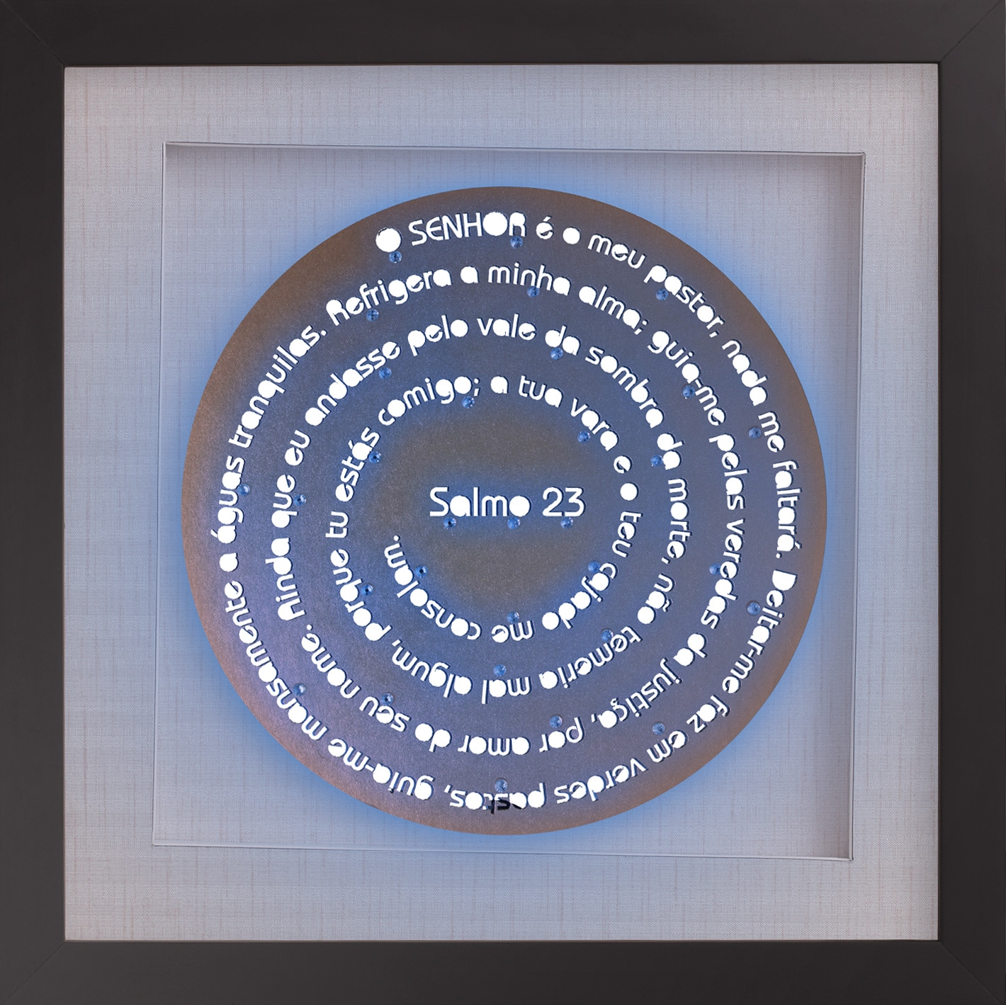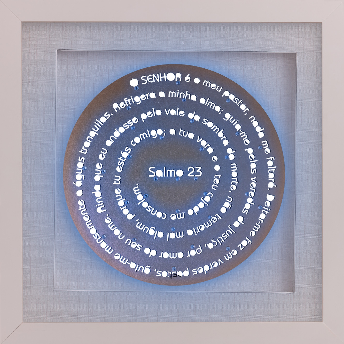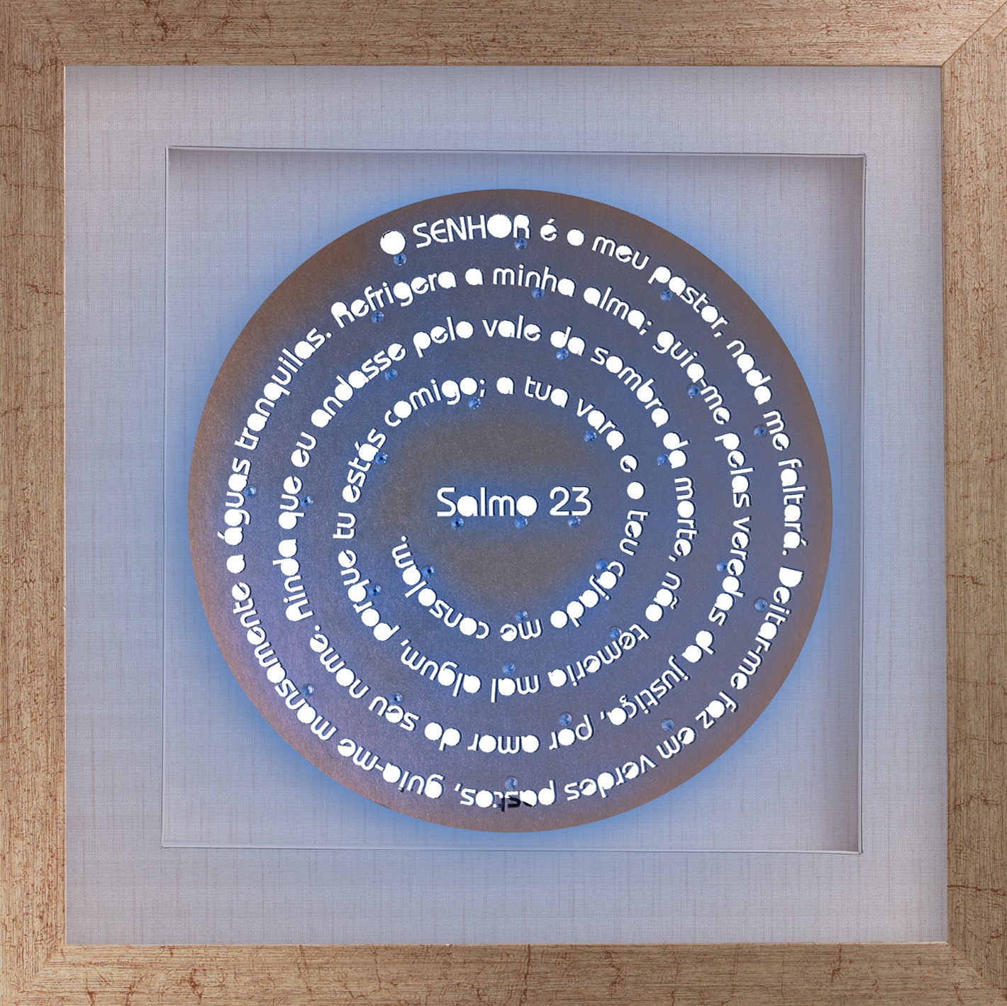 Uma linha mandala com o salmo que todos apreciam e conhecem de cor. Quadro de madeira laqueada (com tratamento contra cupim) e profundidade de 2,5cm. Vidro incolor de 2mm, fundo de papel de parede importado (vinílico), base de fundo foam board (antimofo), colagem de cristais decorativos e iluminação de led. Com moldura nas cores branca, preta, prata, dourada, champanhe e madeira imbuia. Opção de formato quadrado.